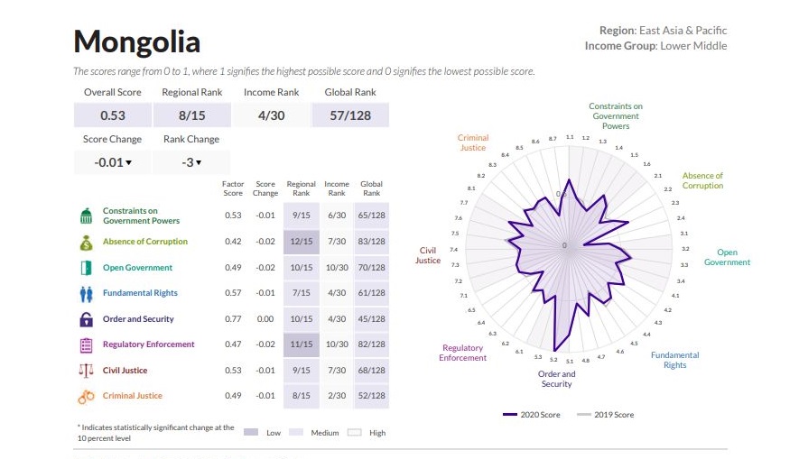At 57th place out of 128 countries worldwide, Mongolia declined three position for overall rule of law performance in the WJP Rule of Law Index 2020 edition.