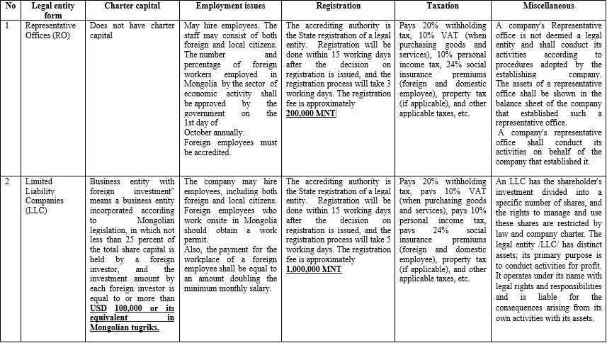 COMPARISON OF SOME LEGAL ENTITY FORMS IN MONGOLIA