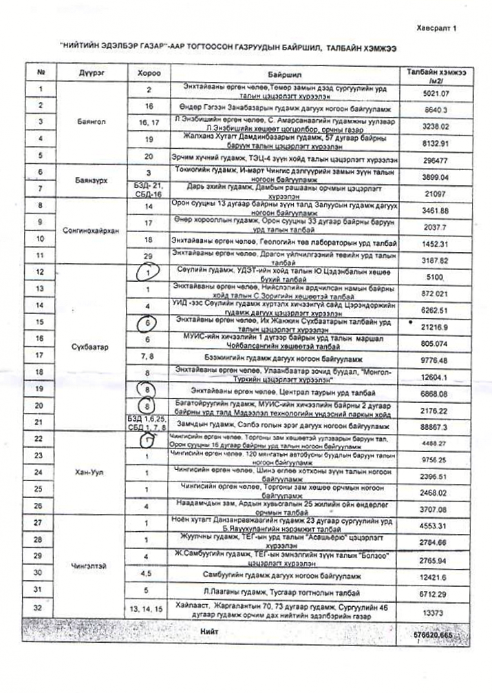 “Нийтийн эдэлбэрийн нийт 86 газрыг эзэмших эрх олгохгүй гэж тогтоол гаргасан байдаг ч тэдгээр газрын эргэлтийн цэгийг тогтоож газрын мэдээллийн санд бүртгэж аваагүй, дүүргүүдийн холбогдох байгууллагад хариуцуулаагүйн улмаас нийслэл, дүүргийн захирамжаар газар олгогдсон байна. Тодруулбал УДЭТ-ийн Цэдэнбалын хөшөөт талбайг 2017 онд Нийслэлийн засаг даргын А91 тоот захирамжаар газар эзэмших эрхийг “Улаанбаатар Капитал” компанид олгосон байдаг. Мөн Сүхбаатарын талбайн урд хэсэг, Цэнтрал тауэрийн урд хэсэг зэрэг газар олгогдсон байна. Тиймээс Нийслэлийн засаг даргын захирамжаар тухайн газрын газар эзэмших эрхийг хүчингүй болгож, эргэлтийн цэгийг тогтоон газрын мэдээллийн санд нийтийн эзэмшлийн талбайгаар бүртгэж авсан. Энэ нь цаашид иргэд амарч зугаалах, нийтийн эдэлбэрийн зам талбай хумигдахаас сэргийлж байгаа юм. Цаашид холбогдох дүүргүүд уг эзэмшлийн талбайн тохижилт үйлчилгээг хариуцан ажиллах, дахин олголт хийхгүй байх талаар гэрээ хийнэ”.