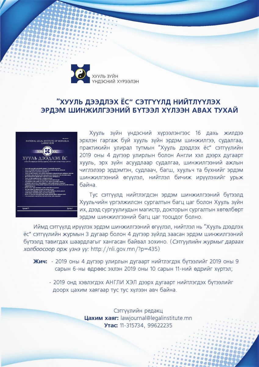 "ХУУЛЬ ДЭЭДЛЭХ ЁС" СЭТГҮҮЛД НИЙТЛҮҮЛЭХ ЭРДЭМ ШИНЖИЛГЭЭНИЙ БҮТЭЭЛ ХҮЛЭЭН АВАХ ТУХАЙ