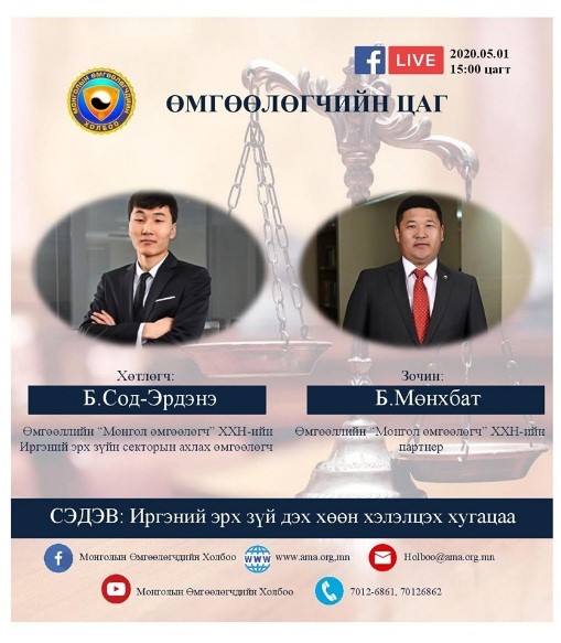 Монголын Өмгөөлөгчдийн Холбоо болон Нийслэлийн Иргэдийн Төлөөлөгчдийн Хурлаас хамтран зохион байгуулж буй “Өмгөөлөгчийн цаг” онлайн нэвтрүүлгийн 2020 оны 5 дугаар сарын 1-ний өдрийн дугаарт Өмгөөллийн “Монгол өмгөөлөгч” ХХН-ийн партнер Б.Мөнхбат “Иргэний эрх зүй дэх хөөн хэлэлцэх хугацаа” сэдвээр харилцан ярилцлаа. Тус нэвтрүүлгийг Монголын Өмгөөлөгчдийн Холбооны холбогдох цахим хуудаснаас хүлээн авч үзээрэй.