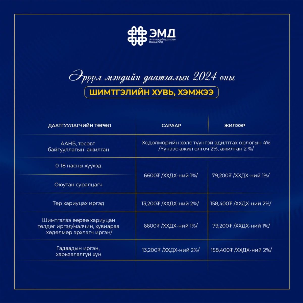 ЭРҮҮЛ МЭНДИЙН ДААТГАЛЫН ШИМТГЭЛИЙН 2024 ОНЫ ХУВЬ ХЭМЖЭЭГ ШИНЭЧЛЭН ТОГТООЛОО