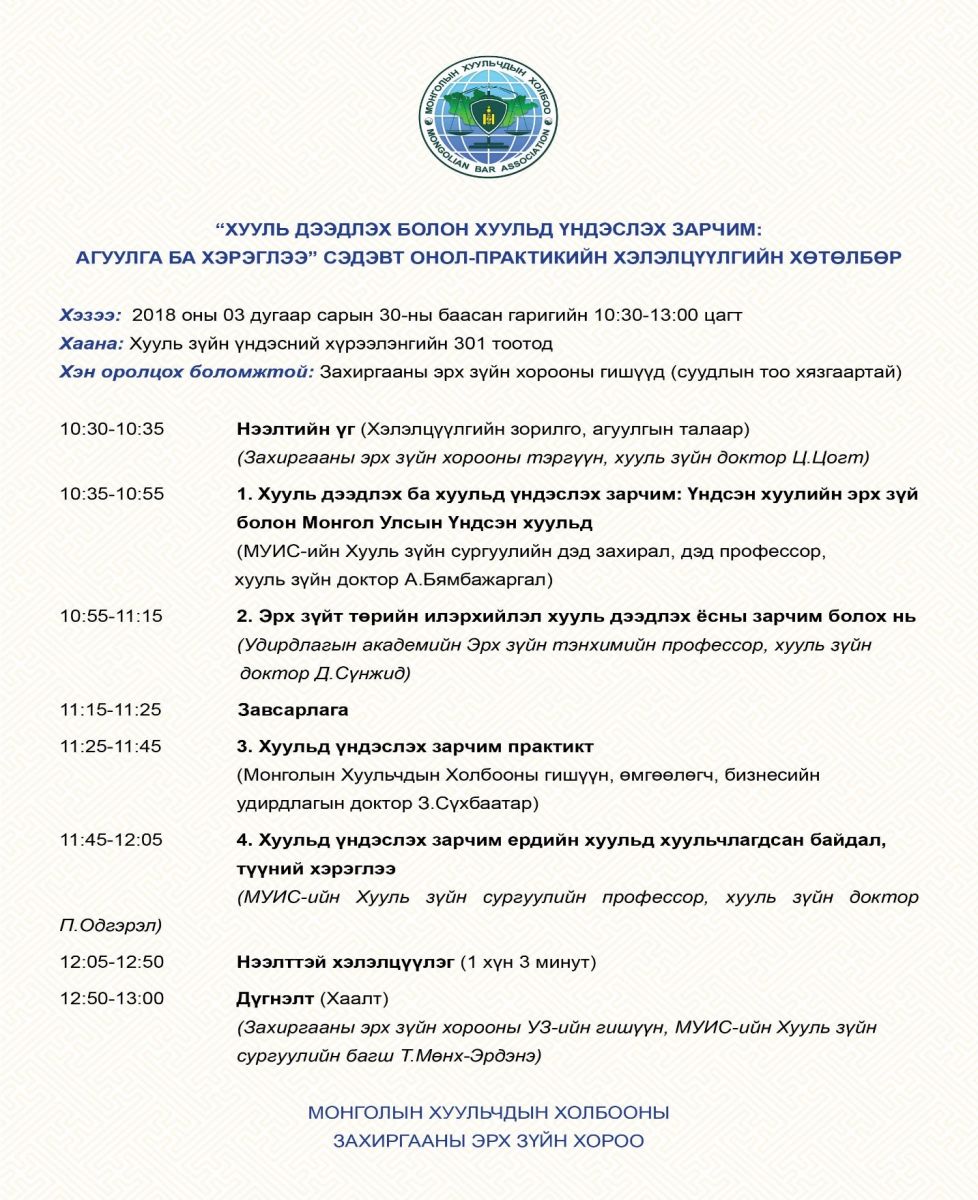 Нийтэлсэн: 8 жилийн өмнө Үзсэн: 2269 "ХУУЛЬ ДЭЭДЛЭХ БОЛОН ХУУЛЬД ҮНДЭСЛЭХ ЗАРЧИМ: АГУУЛГА БА ХЭРЭГЛЭЭ" СЭДЭВТ ХЭЛЭЛЦҮҮЛЭГТ УРЬЖ БАЙНА Эх сурвалж: www.mglbar.mn Хуваалцах Жиргэх