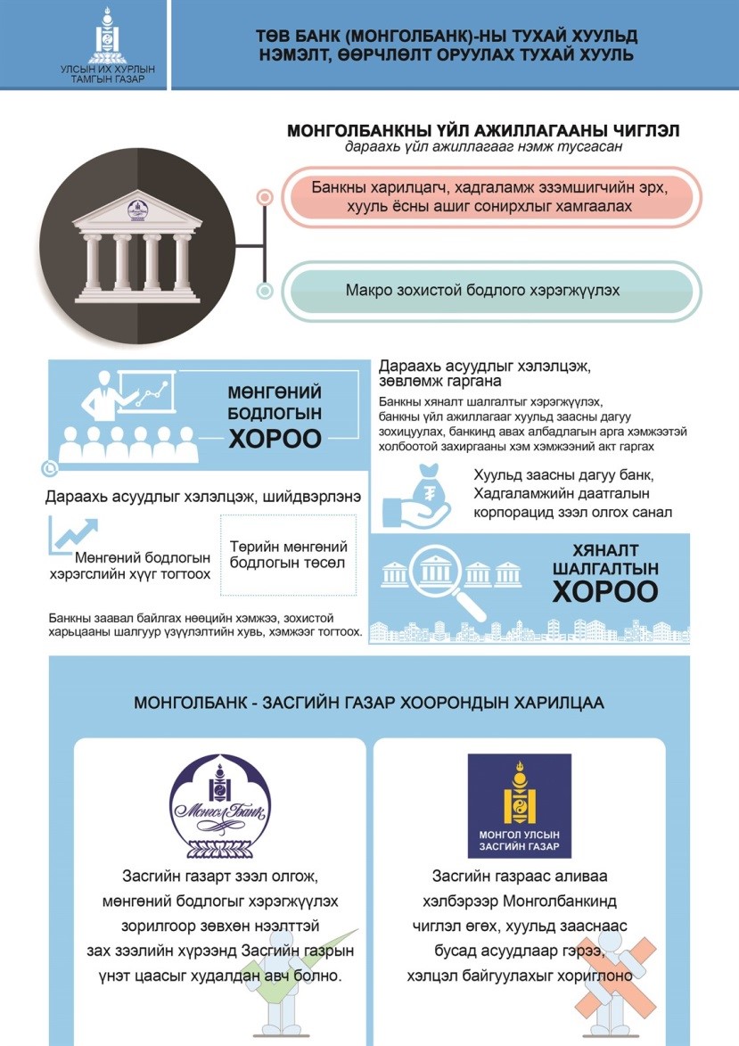 Улсын Их Хурлын 2017 оны намрын ээлжит чуулганаар баталсан хууль тогтоомжуудын талаар бэлтгэсэн инфографикуудыг Улсын Их Хурлын тамгын газраас цувралаар хүргэж байна. Төв банк /Монголбанк/-ны тухай хуульд нэмэлт, өөрчлөлт оруулах тухай хуулийн инфографикийг танилцуулсан байна.