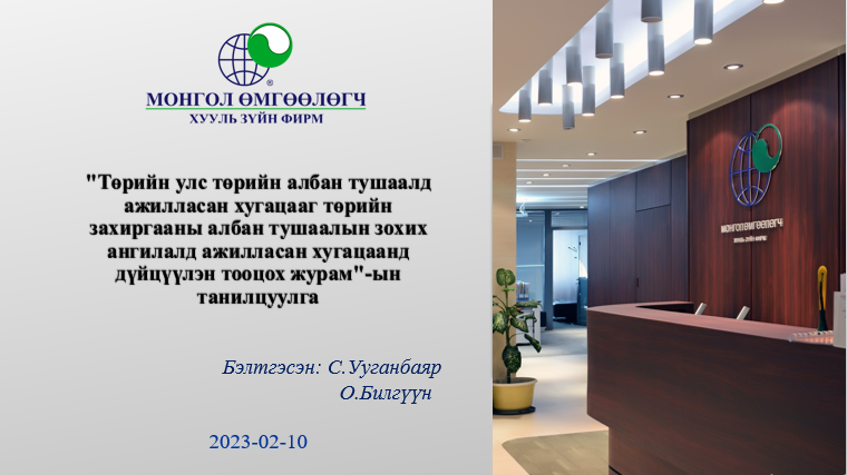 "ТӨРИЙН УЛС ТӨРИЙН АЛБАН ТУШААЛД АЖИЛЛАСАН ХУГАЦААГ ТӨРИЙН ЗАХИРГААНЫ АЛБАН ТУШААЛЫН ЗОХИХ АНГИЛАЛД АЖИЛЛАСАН ХУГАЦААНД ДҮЙЦҮҮЛЭН ТООЦОХ ЖУРАМ"-ЫН ТАНИЛЦУУЛГА from Umguullin Mongol Umguulugch [ ... ]