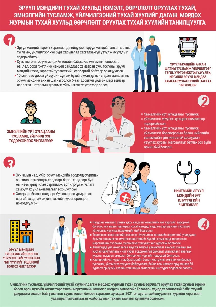 Эрүүл мэндийн тухай хуульд эрүүл мэндийн анхан шатны тусламж, үйлчилгээ болон эмнэлгийн урт хугацааны тусламж үйлчилгээний талаарх зохицуулалт тусгагдаагүй байсныг нэмж тусгах, мөн эрүүл мэндийн урт хугацааны тусламж, үйлчилгээг нийгмийн халамжийн үйлчилгээтэй хослуулах, ахмад настан, хөгжлийн бэрхшээлтэй иргэний бодит эрэлт хэрэгцээнд нь тохирсон цогц тусламж, үйлчилгээг үзүүлэх асуудлыг тодорхой болгох, цахим бүртгэл, хувь хүний нууцлалтай холбоотой хууль, эрх зүйн зохицуулалтыг тусгах, халдварт болон халдварт бус өвчнийг эрт илрүүлэх, урьдчилан сэргийлэх үзлэгийг зохион байгуулах, хэрэгжилтэд хяналт тавих, бүсийн оношилгоо, эмчилгээний төвийг бүсийн хэмжээнд төрөлжсөн мэргэжлийн тусламж үзүүлэх чиг үүрэгтэй болгох, уламжлалт анагаах ухааны оношилгоо эмчилгээг орчин үеийн анагаах ухаантай хослуулан хөгжүүлэх зэрэг шаардлага тулгарсан.