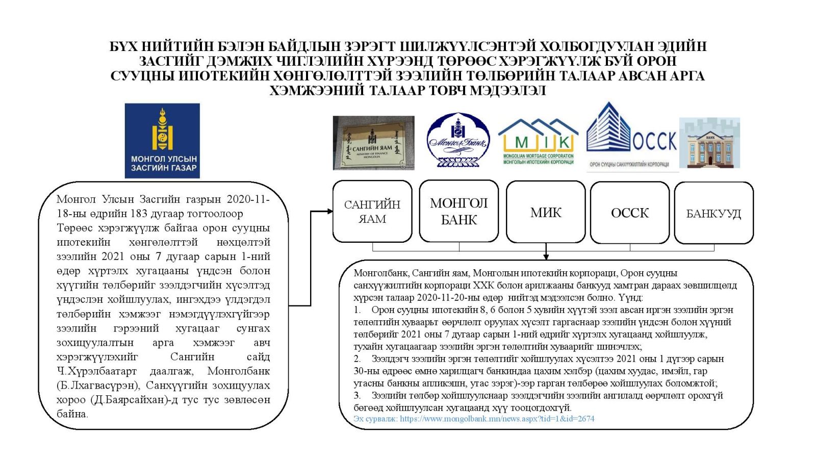 БҮХ НИЙТИЙН БЭЛЭН БАЙДЛЫН ЗЭРЭГТ ШИЛЖҮҮЛСЭНТЭЙ ХОЛБОГДУУЛАН ЭДИЙН ЗАСГИЙГ ДЭМЖИХ ЧИГЛЭЛИЙН ХҮРЭЭНД ТӨРӨӨС ХЭРЭГЖҮҮЛЖ БУЙ ОРОН СУУЦНЫ ИПОТЕКИЙН ХӨНГӨЛӨЛТТЭЙ ЗЭЭЛИЙН ТӨЛБӨРИЙН ТАЛААР АВСАН АРГА ХЭМЖЭЭНИЙ ТАЛААР ТОВЧ МЭДЭЭЛЭЛ