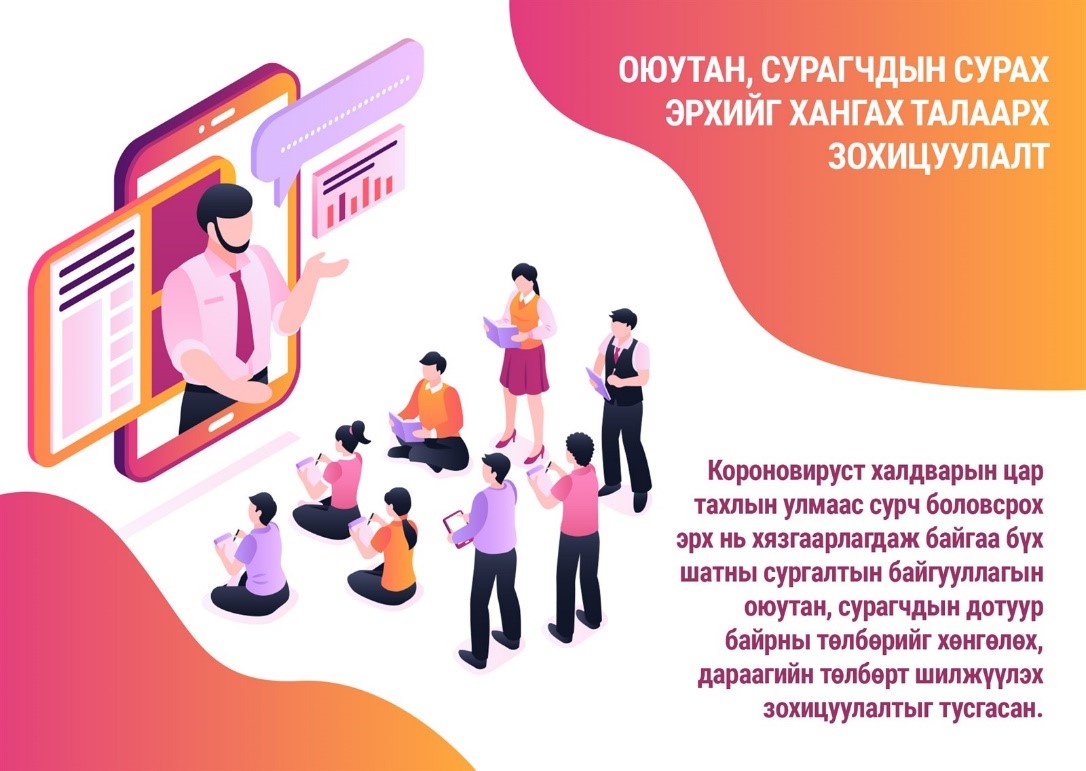 - Короновируст халдварын цар тахлын улмаас сурч боловсрох эрх нь хязгаарлагдаж байгаа бүх шатны сургалтын байгууллагын оюутан, сурагчдын дотуур байрны төлбөрийг хөнгөлөх, дараагийн төлбөрт шилжүүлэх арга хэмжээ авахаар зэрэг асуудлыг хуульд тусгалаа.