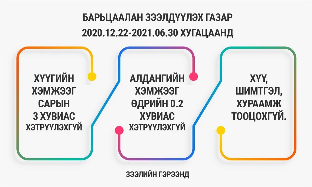 - Эрсдэл бүхий нөхцөлд үүрэг гүйцэтгэж байгаа төрийн жинхэнэ болон үйлчилгээний албан хаагчид зориулсан түрээслээд өмчлөх хэлбэртэй орон сууцны өмчлөх болон түрээсийн төлбөрийн үлдэгдэл хэмжээг нэмэгдүүлэхгүйгээр түрээслэгчийн хүсэлтээр төлбөрийн хугацааг хойшлуулах, төрөөс хэрэгжүүлж байгаа орон сууцны ипотекийн хөнгөлөлттэй хүүтэй зээлийн төлбөрийн үүргийн гүйцэтгэлийг зээлийн үндсэн болон хүүгийн төлбөрийн үлдэгдэл хэмжээг нэмэгдүүлэхгүйгээр хугацааг 2021 оны 06 дугаар сарын 30 хүртэл хойшлуулах, мөн хугацаагаар зээлийн гэрээний хугацааг сунгах асуудлыг Монголбанк Засгийн газартай хамтран хэрэгжүүлэх.