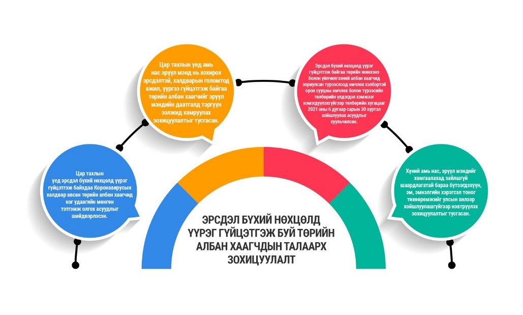 - Цар тахлын үед эрсдэл бүхий нөхцөлд үүрэг гүйцэтгэж байхдаа коронавирусын халдвар авсан төрийн албан хаагчид нэг удаагийн мөнгөн тэтгэмж олгох асуудлыг шийдвэрлэх.